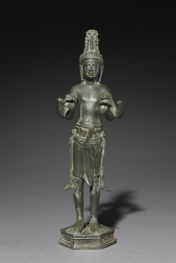 The slender fingers of the left hand hold a water pot while the right hand is in the gesture of the vitarka mudra, a gesture of explanation and exposition.