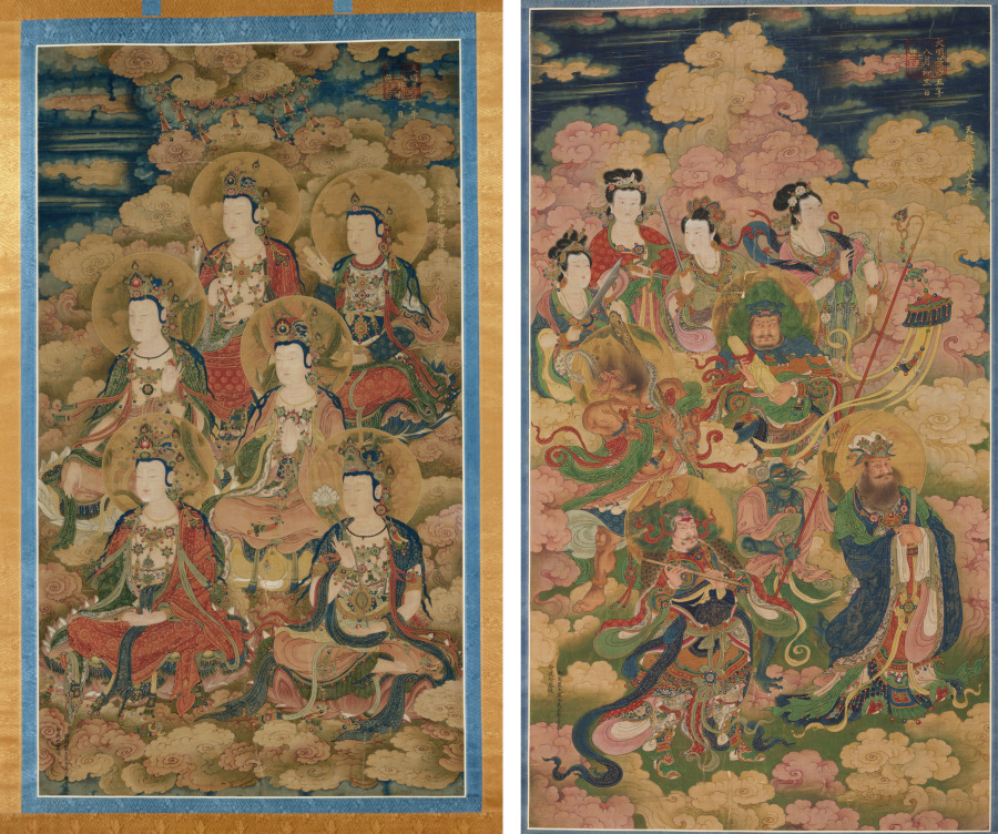 The grandest of the Buddhist mortuary rites is the Water-Land (shuilu) ritual. This esoteric ceremony is conducted for the salvation of “all souls of the dead on land and sea.” The ostentatious ritual was performed for imperial ancestors and high officials from the Song (960–1279) to the Ming dynasties and drew large crowds. On the second day of the weeklong ceremony, paintings are hung in the inner altar. These two scrolls belong to a set of 36 Water-Land ritual paintings that are the finest works of their types known from the Ming period. With their bright, opaque color and fine-line gilt decoration intact and unfaded, both paintings share a remarkable state of preservation. In the upper right corner of each painting is an imperial seal and an inscription in gold reading: Donated on the third day of the eighth month in the fifth year of the Jingtai reign (1454) of the Great Ming. Written in ink in the lower left corner is the record that they were made on imperial order, probably to present them to the Da Longfu monastery in Beijing. One scroll represents the Eight Hosts of Celestial Nagas and Yakshis as described in the Lotus Sutra. The other represents Bodhisattvas of the Ten Stages of Enlightenment undergoing the final processes toward Buddhahood. The sinuous curves of scarf and drapery, the layering of garments, and the minute detail all reflect the opulent visual atmosphere that surrounded the Ming worshipper in temples and spirit halls throughout the country.