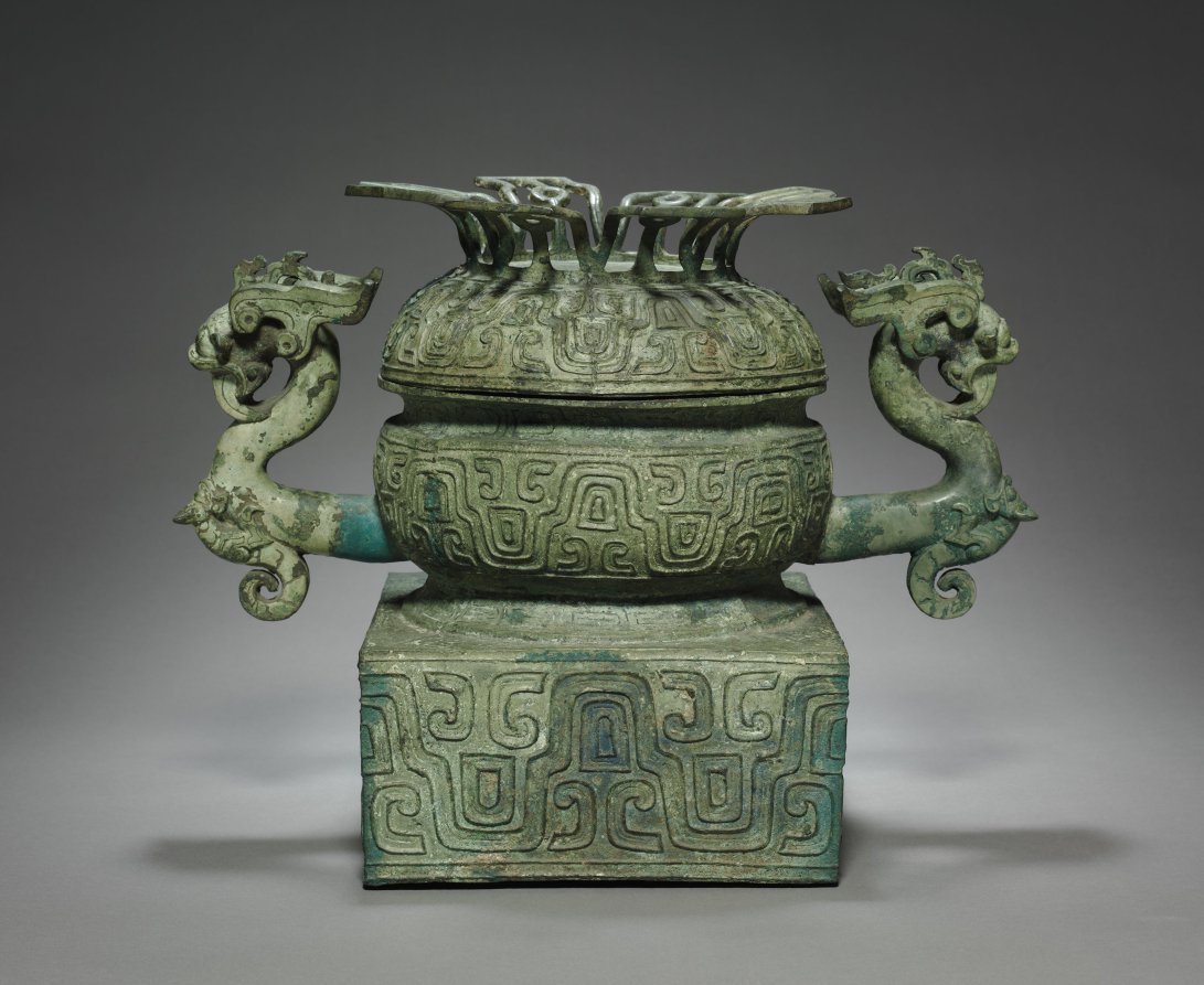 Openwork and sculptural designs elaborately transform the silhouette of this gui, a ritual food vessel with a square pedestal. The design exudes motion, exuberance, and baroque characters to a stately vessel form. Lotus-petal openwork encircles the cover, reinforcing the linear rhythms of the undulating wave patterns on the body. Two lively dragons, with eyes and mouth wide open and tongue straight out, are accompanied by two felines to form the arched handles.
