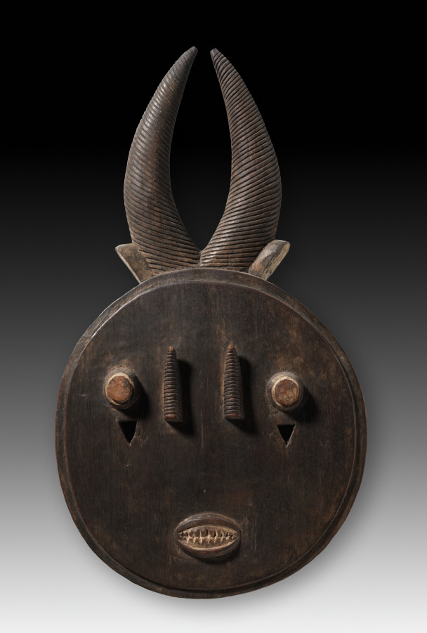 This kple kple mask belongs to the first of four pairs of masks that entertain as part of a performance sequence in the goli dance. The male in each pair dances first. The masks are worn by young boys in a rapid stamping dance. The masqueraders alternate with each other and watch their partners perform. The head of the male kple kple is painted red, whereas the female, like this example, is colored black.