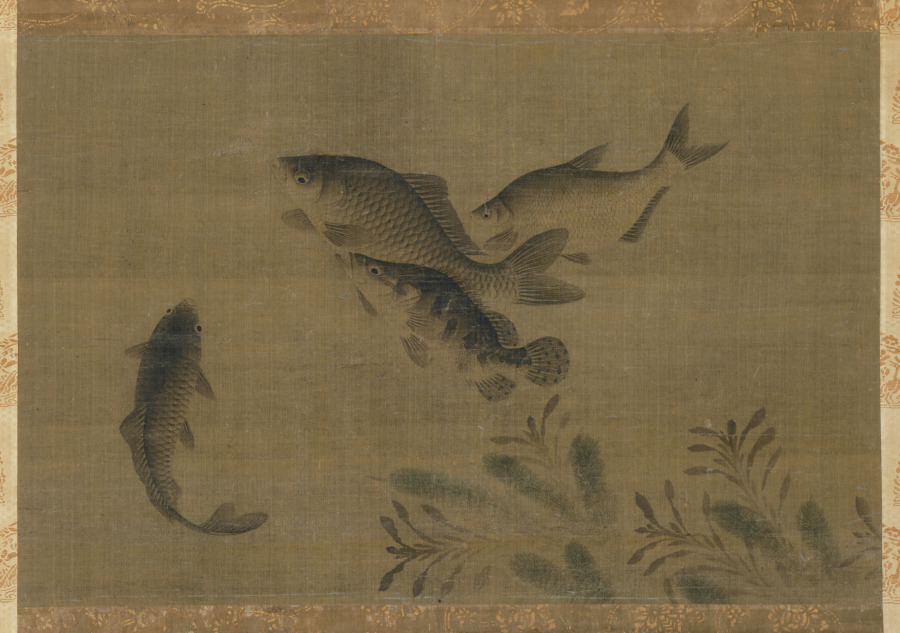 Four fish of various sizes are swimming among aquatic plants. Like in other paintings, the existence of water is suggested in the harmonious movement of the fish and plants. In Chinese, the word for fish (yu) is a homophone for “abundance” and thus the motif has an auspicious connotation. The painter uses the so-called boneless technique without outlines to shade and texture the bodies of the fish. The smooth transition from dark shades on their backs to their white bellies and the thin transparent fins and tails in light washes accentuated by gills and scales are all executed without contour lines.