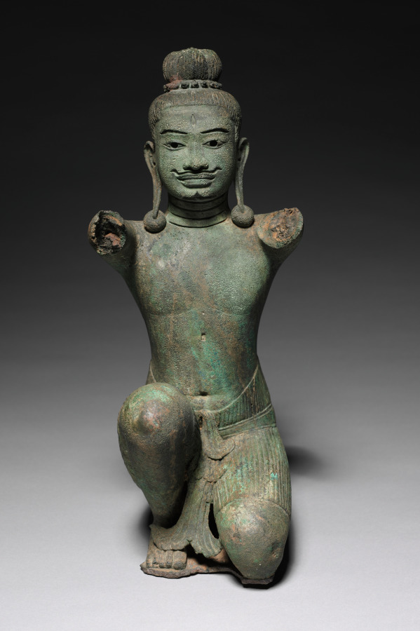 The third eye in the forehead indicates that this figure identified himself with Shiva, but his kneeling stance with hands raised in a gesture of adoration indicates that he is a devotee of Shiva, who has taken on aspects of the god's physical appearance. The style of the lower garment with the low-slung belt is typical of work from the so-called Baphuon period of Khmer sculpture, like the stone standing image to the left. The eyes, eyebrows, moustache, and beard were once inlaid with silver.