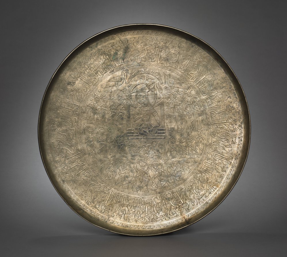 The central subject is an enthroned ruler surrounded by couriers and musicians. The wide border is filled with an elaborately animated Kufic inscription in which the shafts of the letters terminate in human busts, representing musicians and warriors; various animals; and human hands, holding a variety of symbolic objects. This complex inscription has not yet been deciphered; it appears to be in Persian and to contain only benedictory phrases. Around the outside of the rim, an Arabic inscription, in nashki letters, reads: "You elevated one [of God's] creature[s] and he has ruled with good fortune and blessing and happiness and security and felicity and victory." That the scene does not refer to a specific royal personage but is rather only a representation of the abstract concept of the "Heavenly Banquet" as a symbol of apotheosis indicated by the banner held over the head of the enthroned figure, which actually proclaims this vessel to be "the work of Ibrahim the Decorator [or the Engraver]."