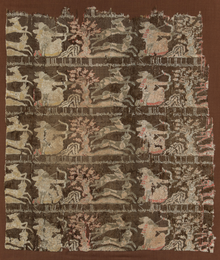 An archer kneels to left of a tree and the hill to shoot at pair of deer. The polychrome design is repeated across horizontal rows on dark brown ground.