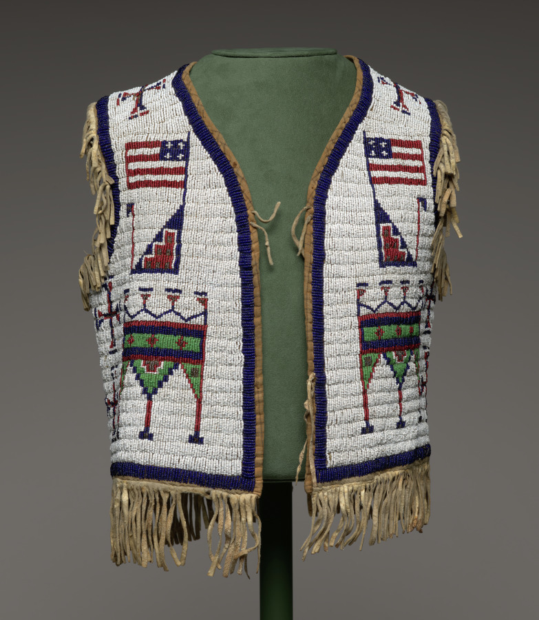 For centuries, beautiful garments and objects have held great meaning for the native groups of the Great Plains. For instance, the Lakota (Sioux) ceremonially intone something sacred wears me. That is, humans don powerful garments but are worn, animated, and protected by the sacred forces within their materials and imagery. By 1700 European Americans began to make their presence felt in the region, and Plains people creatively adopted European materials and garment types into their wardrobes. By 1870 most Plains people had been forced onto reservations, and traditional life shattered—especially for men. The garments on display here all were made after that date.