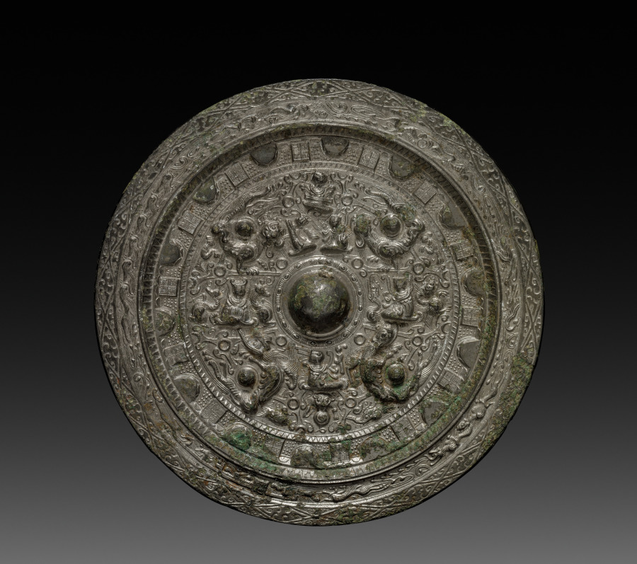This mirror depicts Xiwangmu, Queen Mother of the West, and her husband, Dongwanggong, King Father of the East, surrounded by mythical figures and animals. One of the earliest and most powerful goddesses in the Daoist pantheon, Xiwangmu can be identified by her U-shaped crown. Legend says that the two deities meet once a year representing the meeting of yin and yang, the two forces that constitute the universe. This mirror shows a band of 14 squares around the center containing a long inscription.