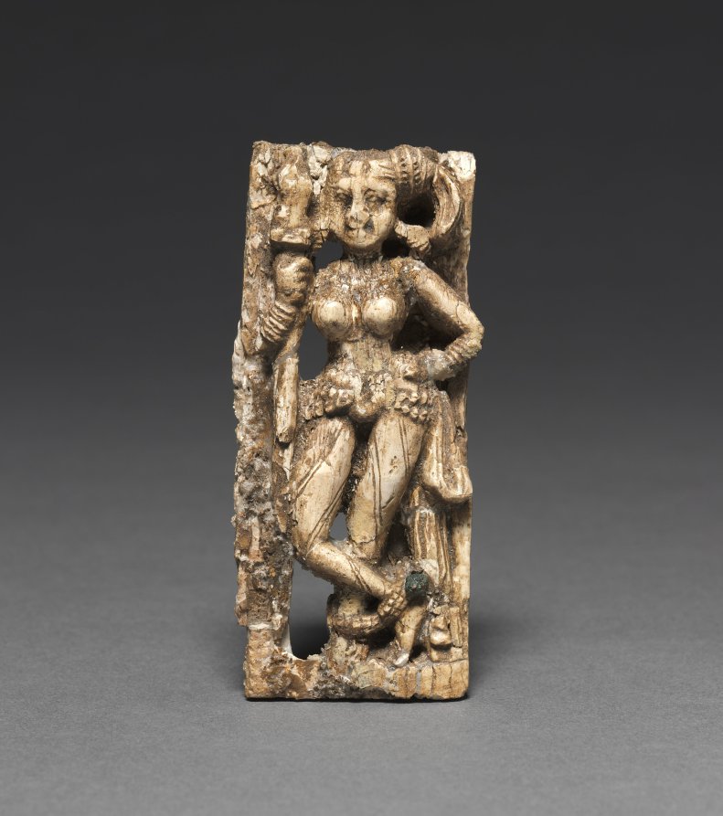 This smiling female figure has her hair tied up to one side, wound around with an embroidered strip of cloth. She stands akimbo with her upper garment removed and tied in a loose looped knot at her side. A broad girdle holds up her clinging, diaphanous skirt. She has the ideal female form of a young mother, and since she holds a spear, she may have served a protective function.