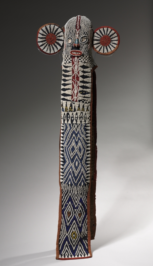 The name given to masks like this, mbap mteng, means "animal with huge ears." In the Cameroon Grassfields kingdoms, the elephant signifies power, authority, prestige, and leadership. The colorful glass beads that decorate the mask’s surface were imported from Venice and Bohemia (in Europe) and signal wealth and prosperity. Its geometric patterns include triangles that evoke the leopard, another animal linked with royal power. Members of Kuosi, an elite male society, wore such elephant masks for ritual dances and funerary ceremonies. This mask would have been worn with a costume that included a feather headdress