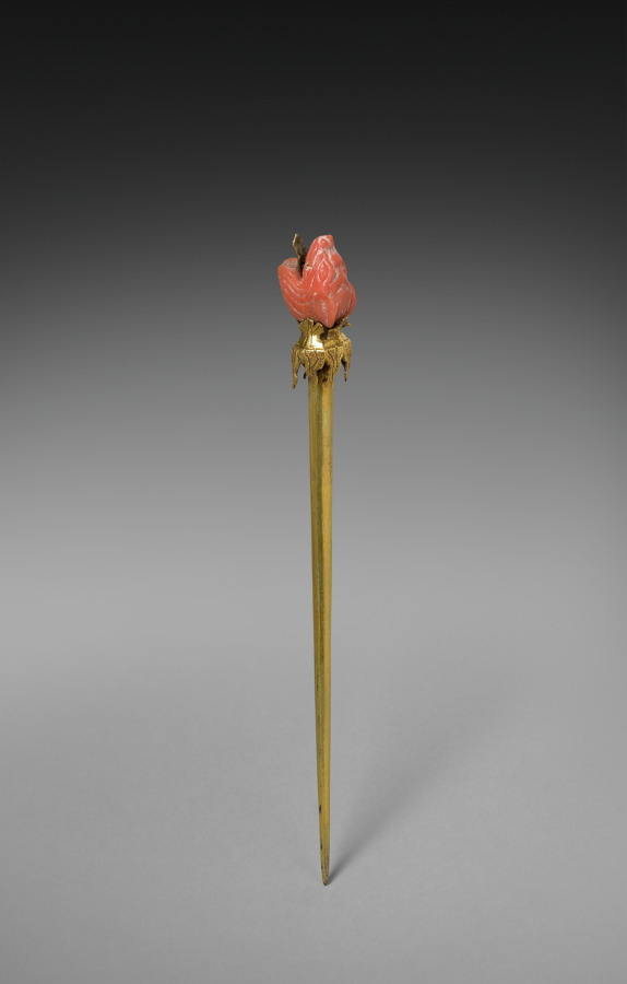 enameled shell and coral, gilt-silver mounts; detachable pick with dragon's head finial