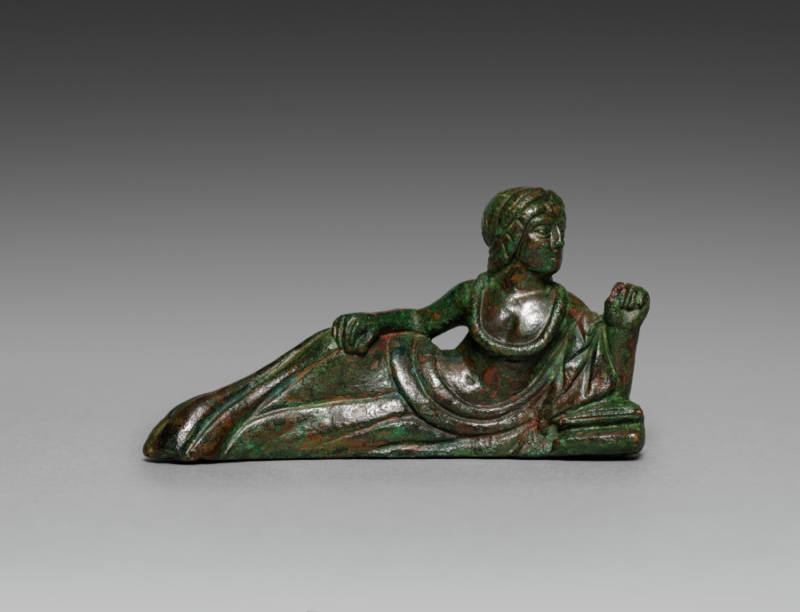 This bronze banqueter figurine was one of six once adorning the rim of a large basin, now lost. Cast in molds with individualized details, most have grooves on their underside to attach to the basin. Minute traces of gilding remain on areas of clothing and skin (mostly visible only under magnification), suggesting that they may have been completely gilded. Two handles in the form of hippocampi, horses with serpentine tails, also belonged to the basin and are now displayed [https://collections.carlos.emory.edu/objects/18237/handle-from-a-foot-basin-in-the-form-of-hippocamps] at the Michael C. Carlos Museum at Emory University. The basin may have been used to hold liquid for a banquet, or was perhaps funerary. This banqueter tilts his head toward his left hand, which may have once held an object, now lost. His right arm rests on his hip. Unlike the other banqueters, this figurine does not have exposed feet and his body curves slightly when viewed from above. This suggests that this figurine may have been made for a different initial use before being added to this set.