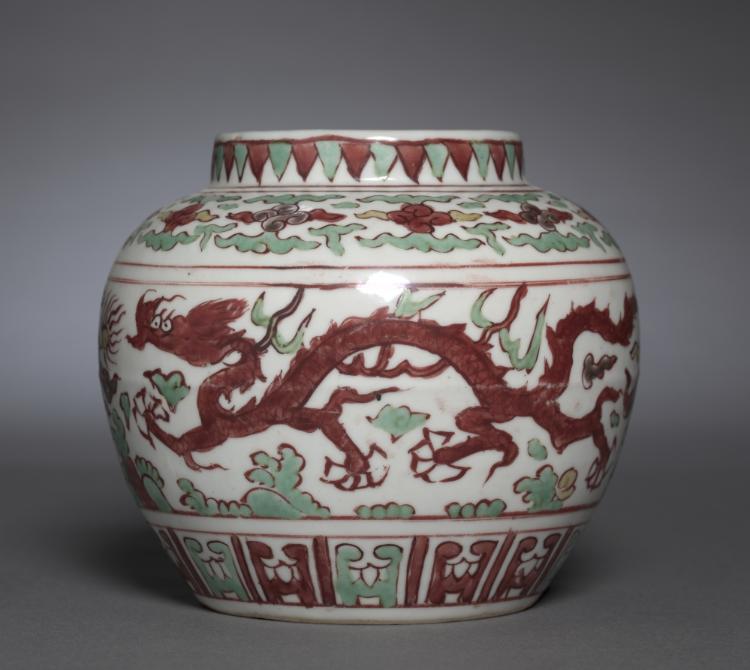The exterior of this jar is ornamented with two rampant five-clawed dragons boldly drawn in rouge de fer. The dragons are in pursuit of the sacred jewel amid cloud scrolls in green and yellow, flanked at the top and bottom with broad registers of cloud scrolls and gadroons. The underfoot is glazed and bears a six-character nianhao in the form of a vertical mark reading "Daming Jiajing nianzhi," enclosed in double rings in underglaze cobalt blue.