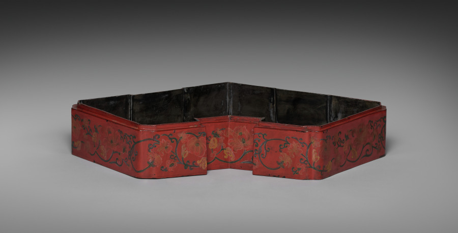 red lacquer over a wood core, with litharge painting and engraved gold designs (Ryukyuan)