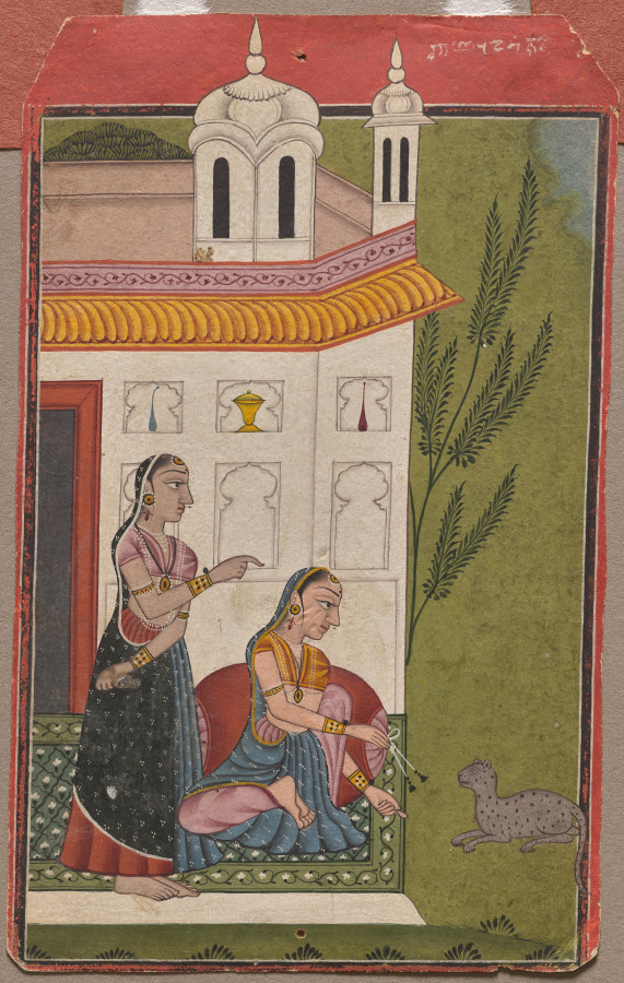 The sound that serves as the basis for this musical mode is the voice of the cat. Paintings of Patamanjari Ragini are set on the outdoor terrace of a fine house, complete with niches holding vessels. The heroine sits in front of a bolster on a green floral carpet that the artist has tilted up so as not to obscure its pattern. The spotted gray cat appears shy, and the heroine is trying to entice it with a morsel, while she gestures for it to come.