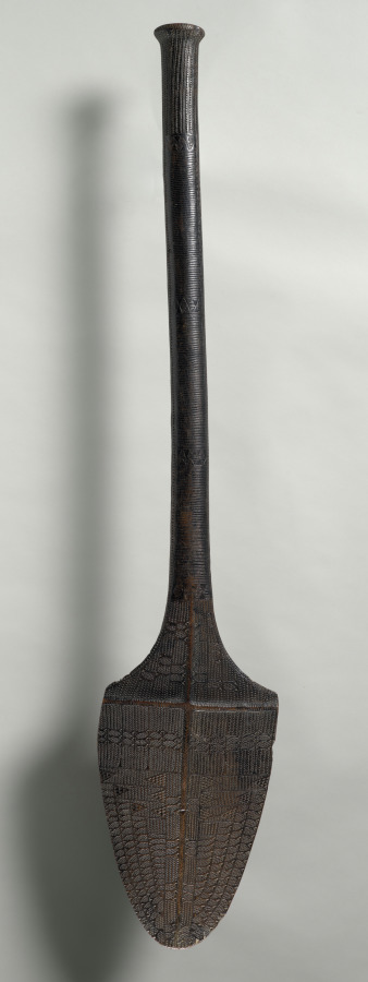 Fijian weapons are made of heavy, dense wood, ornamented with fine, chip-carved patterning. The paddle-like shape of this example is quite rare.