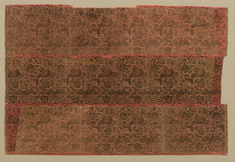 Central Asian designers drew from a wide variety of motifs, both imaginary and real. In this silk, rows of soaring phoenixes alternate with rows of makaras. Combining a fish body and tail, wings, and a dragon's head, the makara originated in India as a water creature. With the spread of Buddhism, the motif migrated into the art of Central Asia and, from there, into the art of northern China. In Italy, exotic Central Asian patterns such as this inspired flights of imagination. One such example (seen in the photograph below) shows a creature, strikingly similar to the makara, spewing forth a dragon while a dog walks up its back.