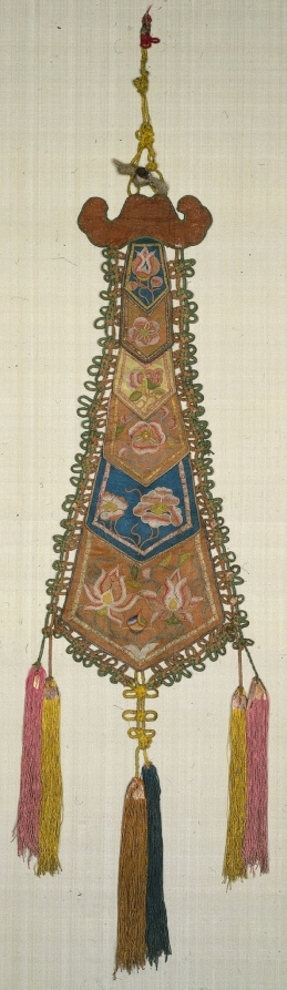 Pendants were used extensively in Buddhist settings where they were attached to almost anything needing decoration: ritual objects, canopies, valances, pillars, and other architectural components. They could be made in a variety of ways. This example consists of a heading and six tiers, each embroidered separately and then attached, one to the next. The earliest known pendant of this type was found in Central Asia and dates from the Tang dynasty (AD 618-907). The 14th-century date of this pendant is indicated by the style of the flowers.