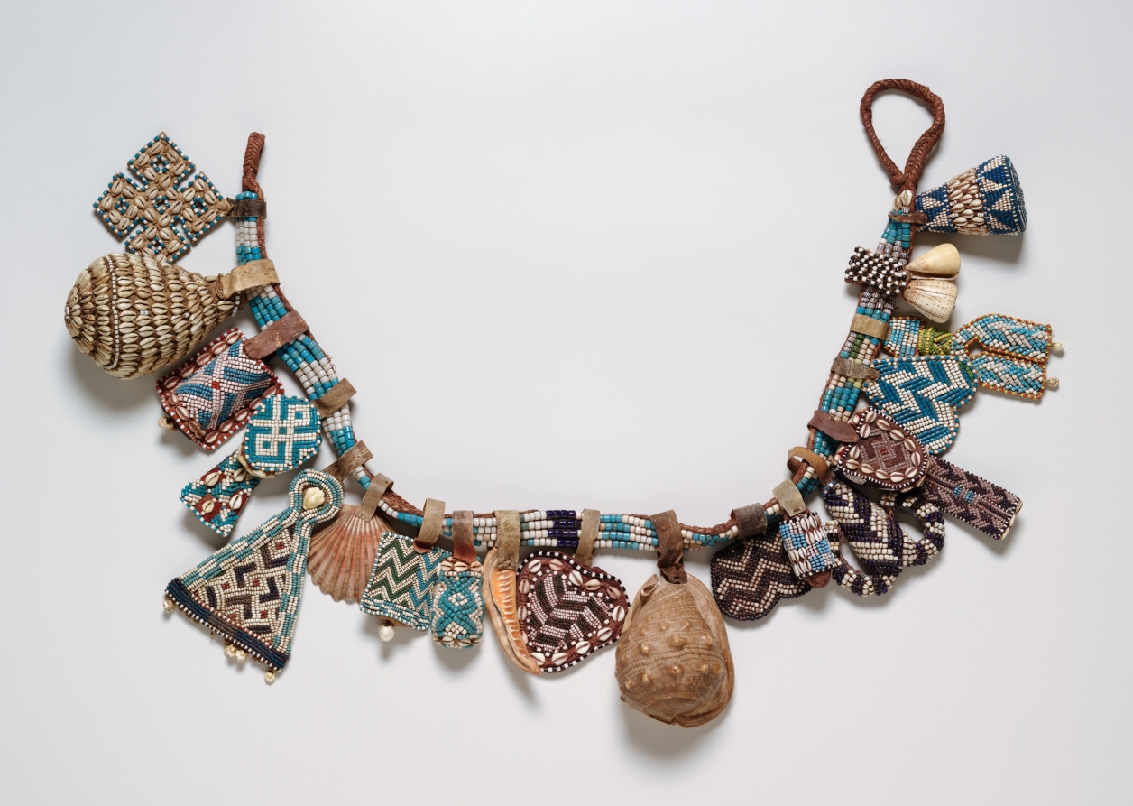 Attributed to Kuba peoples of southeast Democratic Republic of Congo, this prestige belt boasts superb craftsmanship. The accumulation of a variety of materials indicates the high status of its wearer. It is made from leather strips and finely accessorized with a combination of intricately patterned bead designs, cowries, seashells, and bells. It would have been worn over a large raffia skirt by a man during ceremonial occasions. It was acquired from the Belgian dealer Jacques Hautelet in 1994.