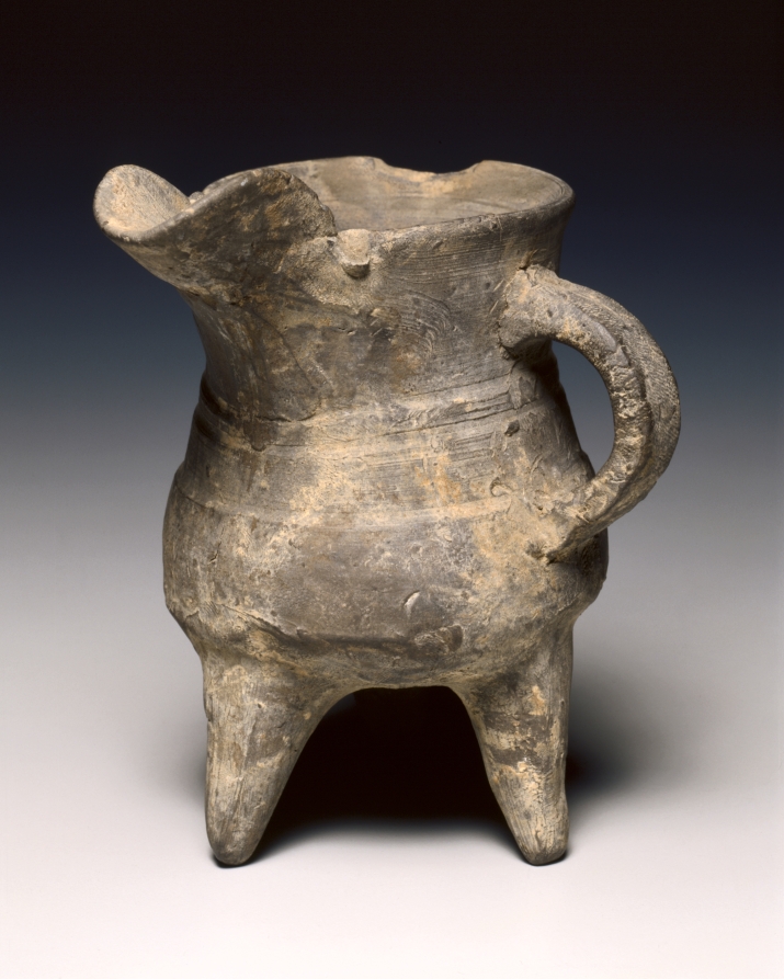pottery, tripod vessel with loop handle and rudimentary bowstring decoration