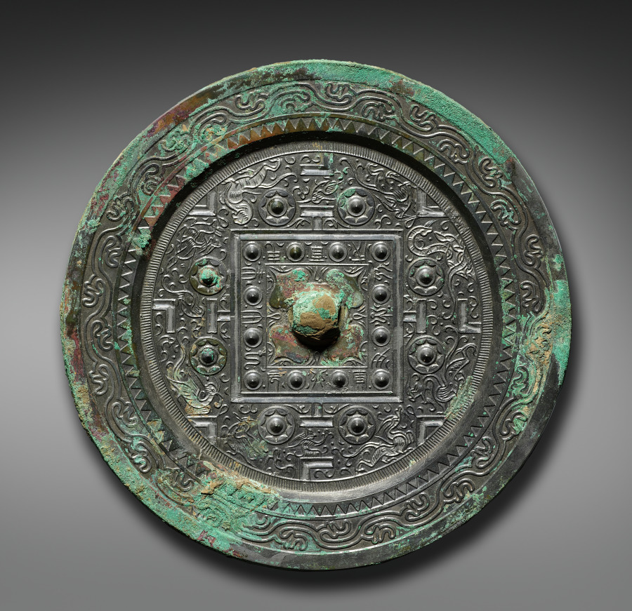 The back of this mirror shows a diagram of the universe. The concentric rings and swirling cloud band border represent heaven, while the square field around the knob designates the earth. The four directional spirits in the form of animals occupy the space between heaven and earth and are cast in fine lines between the band of swirling clouds and outside the square: the tiger guarding the west, the dragon protecting the east, the red bird representing the south, and the snake-entwined turtle guarding the north.
