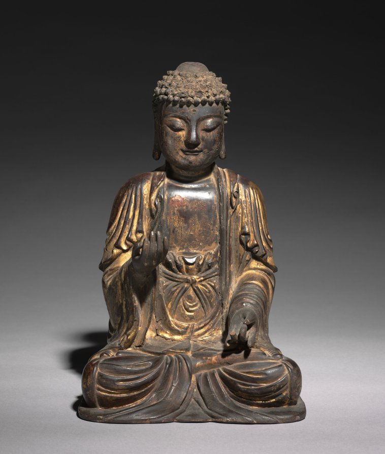 In Buddhist art, buddhas (supreme beings who entered the world of nirvana) and bodhisattvas (compassionate beings committed to the attainment of enlightenment for others) are two main subjects. The religious role of buddhas and bodhisattvas—to lead all sentient beings to the realm of Buddhahood—is the same, yet visual languages to represent them is different. As shown in this statue, the Buddha is represented as a monk with shaven head and dressed in simple monastic robes. Bodhisattvas, on the other hand, are adorned with elaborate jewelry and a lock of long hair.