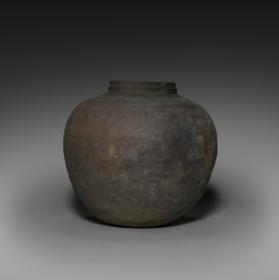 This storage vessel is distinguished by its robust, subtly proportioned form and its body color. The purplish-brown surface "skin" is enlivened by a series of smoky black swirling marks that occurred during the firing in the wood kiln. This shape began as a series of clay coils that were pinched and then paddled; however, it spent more time on a potter's wheel to thin and finish its outer surface. The lid received similar, understated attention to detailing and finish.
