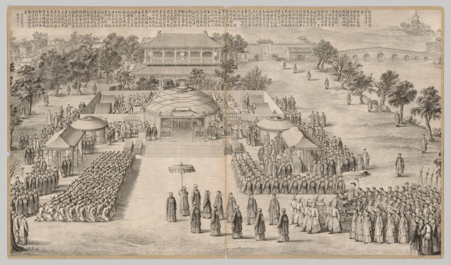 This set of etchings was commissioned by Emperor Qianlong to record in pictorial terms the courage of his generals and soldiers in quelling the rebellions in the Western Regions. Qianlong added his own poem to each of the etchings, indicating his appreciation and pride in this demonstration of military might. "Western Regions" refers to the present-day Xingjiang province, often described in Western writing as "Central Asia."