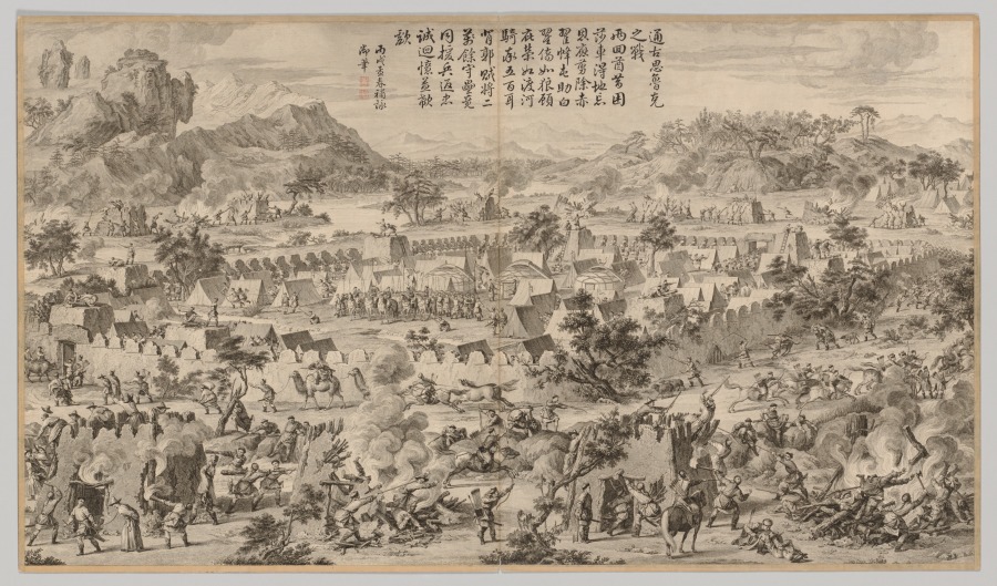 This set of etchings was commissioned by Emperor Qianlong to record in pictorial terms the courage of his generals and soldiers in quelling the rebellions in the Western Regions. Qianlong added his own poem to each of the etchings, indicating his appreciation and pride in this demonstration of military might. "Western Regions" refers to the present-day Xingjiang province, often described in Western writing as "Central Asia."