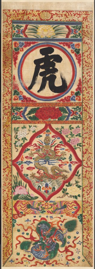 This set of four colorful hanging scrolls may have been used in an outdoor Buddhist ritual to evoke heavenly blessings. Each hanging scroll bears four different character; tiger, dragon, whistle, and recite. Traditionally, tiger and dragon belong to the four directional guards, respectively west and east.