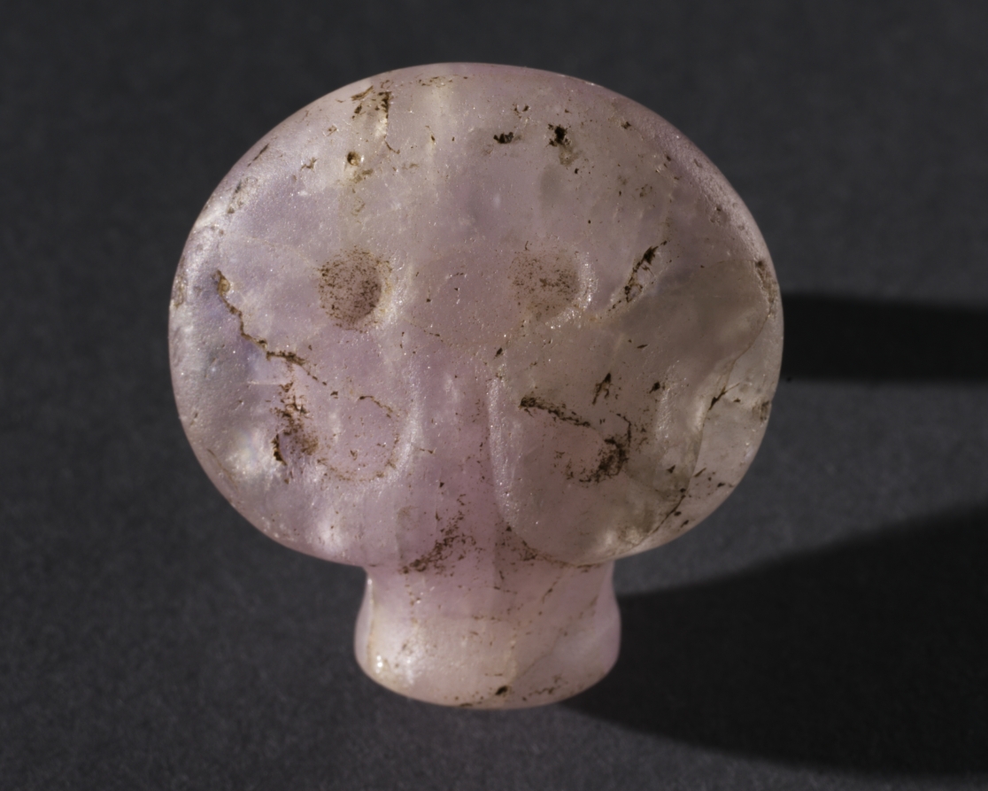 This stunning amethyst amulet takes the shape of the head of a bull, an animal renowned from the earliest times in Egypt for its natural strength. The image presented is abstract, with only the most important of the animal features being represented: horns that curl downward in low relief, large eyes, and a narrow, cylindrical snout. The back is pierced horizontally for suspension. A well known but rare type, the bull's head amulet is also one of the earliest of all amulets from ancient Egypt, datable to the Predynastic period (4000–3000 BC). The outstanding composition and luxuriant violet hue of this example single it out as one of the very finest of its kind.