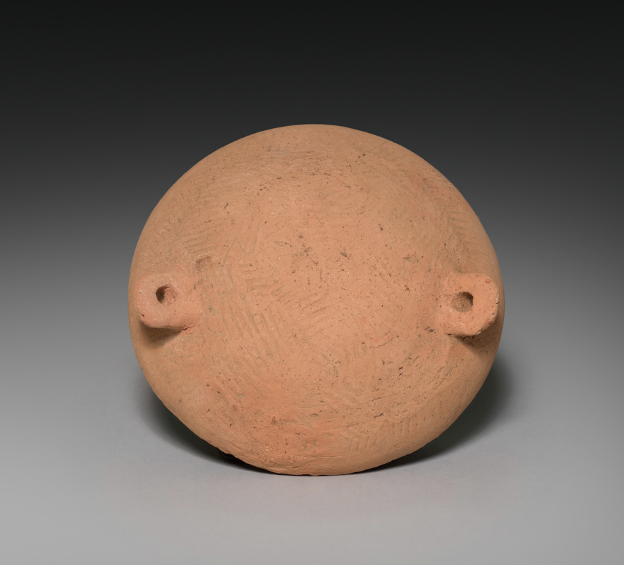 This small storage jar was hand built from coils of clay before it was finished on a potter's wheel. The thick, vertical ridges covering the surface were impressed into the wet clay using a carved wooden paddle. This network of raised lines was then intersected by four incised lines coursing around the bulbous form and separating the body into lower and upper areas with deft visual simplicity. Such direct, effective design solutions to ceramic decoration appear frequently in early Korean ceramics. The two perforations in the upper body were no doubt used to help secure the lid to the body with a cord.