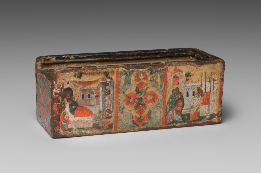 John the Baptist--the first person to recognize Christ as the promised savior and the one who baptized him in the Jordan River--was one of the Byzantine Empire’s most revered saints. This box shows four scenes from the saint’s life: John’s martyrdom, Christ’s baptism, John’s birth, and the announcement of his birth to his parents. It probably once housed one of the saint’s relics; several were kept in churches and monasteries in Constantinople, including fragments of his skull and right arm and locks of his blood-clotted hair.