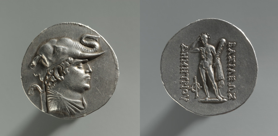 Demetrios I (222–180 BC) ruled the Indo-Greek kingdom of Bactria from 200 to 180 BC and minted this coin to commemorate his conquests over territories to the south, in present-day Pakistan. He linked his image on his coin to Alexander of Macedon (356–323 BC), who depicted himself with a lion scalp after his conquest of India; Demetrios substituted an elephant for the lion. On the reverse is Hercules, also identified with Alexander.