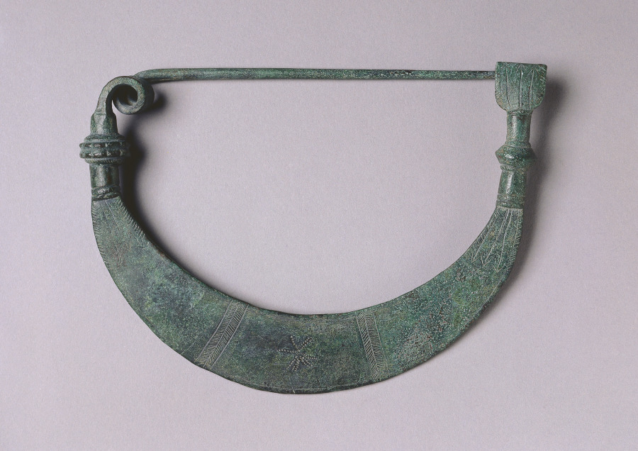 The crescent body of this bronze fibula (brooch) features both incised and punched decoration. Three sets of three arrows have been interpreted as indicating the daily route of the sun, shown at the arc’s center as a series of radiating punch marks within a shallowly incised circle. When worn, the arc may have hung downward, a large ornamental addition to the functional pin used to secure its wearer’s clothing.