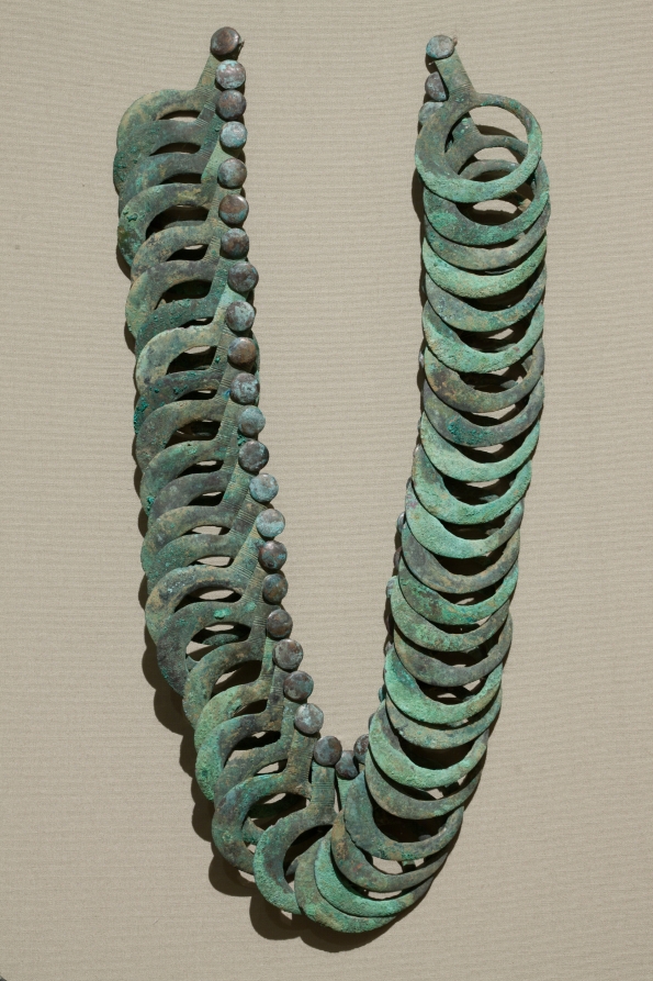 45 separately cast pendants overlap one another when strung together and hung, reversing course at the bottom.