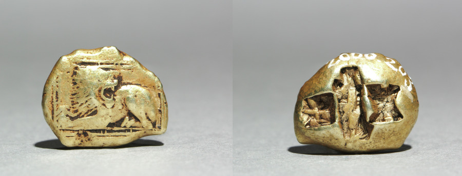 The lion, king of the beasts and an animal associated with regal and heroic power, featured prominently on the coinage of many ancient Greek city-states. Artists placed the lion in a variety of poses, sometimes including the whole body, at other times the foreparts or just the head. Although it may once have roamed nearby, for many Greeks the lion was a monster nearly as exotic as the Chimaera, of which it formed a part, together with a goat head and snake-headed tail.