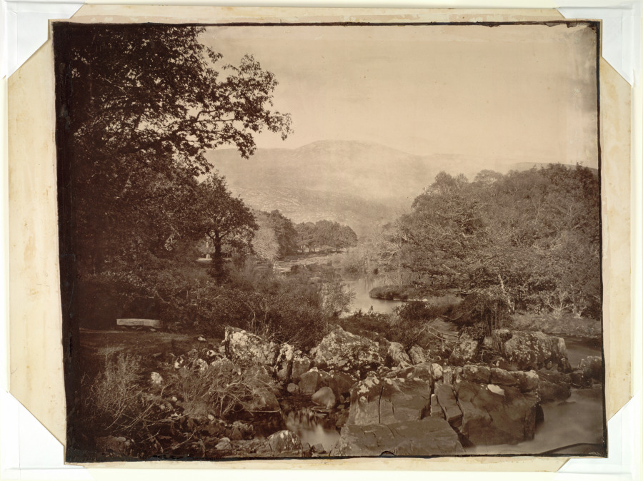 A distinguished photographer who received royal patronage, Vernon Heath traveled extensively throughout the British Isles documenting estates and landscapes on commission. This carefully composed scenic view, taken just above the Upper Lake of Three Lakes of Killarney in southwest Ireland, exemplifies the pioneering technique he developed in the early 1860s for enlarging 12x10-inch glass negatives. Made when contact printing was the norm, Heath’s carbon-printed enlargements showed no distortion and preserved the general artistic effect, which brought praise from the photographic press. Through his outstanding ability to manipulate wet collodion plates in the field, he excelled at controlling light and rendering aerial perspective. Indeed, Heath was highly acclaimed for the pictorial detail and faithful description of the picturesque scenes his Victorian audience so admired. By 1871 the carbon pigment process was his preferred method for printing. It produced a softening effect and greater gradation of tone in his photographs while rendering them impervious to fading caused by natural light.