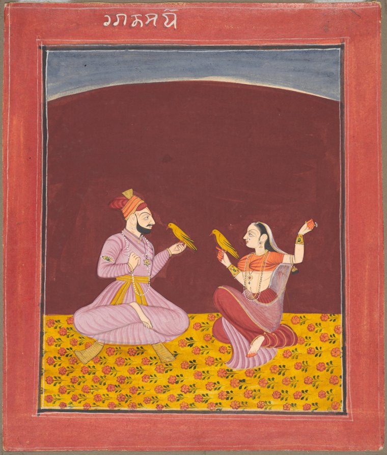 This specific musical mode is distinguished by a courtly couple sitting together without touching in a domestic space. They each hold a tame bird. Some consider the birds to be of the type used in elite hunting practices. The Pahari region of the northwest Himalayas was famous for its native hunting birds that were prized gifts among the nobility throughout South Asia. The woman is shown with equivalent confidence in handling the bird as her male companion. Although the inscription written in Takri script in the upper margin labels this scene as Kamod Raga of Dipak, the imagery pertains to the Kausa Ragaputra of Malkos