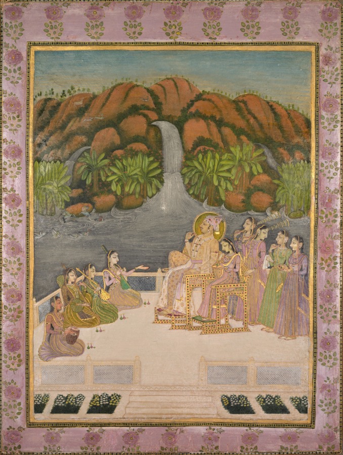 The ruler of the princely state of Kishangarh chose to have himself depicted in an intoxicatingly paradisiacal setting. He and his queen occupy jeweled chairs on a white marble terrace with formal flower gardens overlooking a lake. They listen to a musical performance while female attendants stand ready to whisk away flies and serve tiny bottles liquor. The fresh palette and dramatically elongated eyes, especially on the women, are hallmarks of the most celebrated works from this Rajput court. The king is portrayed with less exaggerated features than the women, which makes him seem more human, despite the halo that sets off his face and elaborate turban.