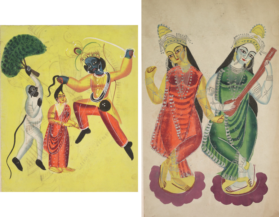 Leaf from a Kalighat album: Hanuman attacks Indrajit holding an apparition of Sita by the hair (recto); Goddesses Lakshmi and Sarasvati (verso)