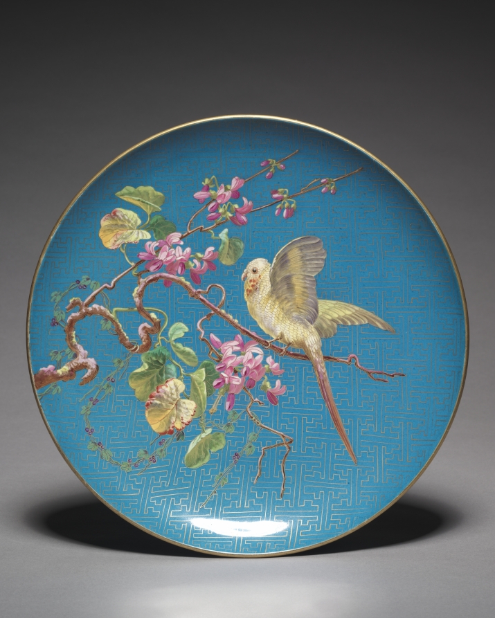 This decorative charger is an exceptional example of the Japanese taste in 19th-century French decorative arts. Influenced by cloisonné exported by Japan when the country opened it borders to the West in the 1850s, this charger features parrots in lush foliage before a blue background that imitates cloisonné. The exceptional nature of the enamel decoration is due to the fact that this charger was created by Daubron Frères for exhibition at the 1878 Paris world's fair. An inscription on the back documents the inclusion of this particular piece in the fair.