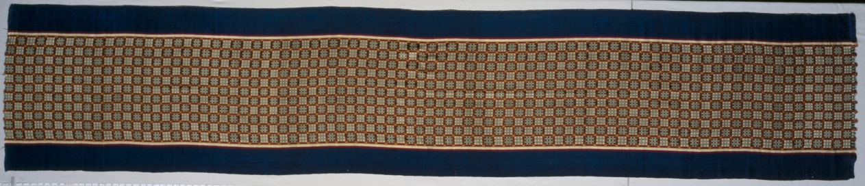 Msimsim wall hangings were one of three standard marriage gifts (ṣdāq or mahr) from a groom to a bride in Tétouan, Morocco, as recorded by marriage contracts from 1794 to 1894. These gifts indicated the financial commitment of marriage: divorce occurred if they weren’t promptly received! This msimsim was made from silk harvested in Tétouan, or from raw Asian silk imported via Marseille. Its traditional design is a double-sided gridded brocade (raised woven pattern), navy on one side, crimson on the other. When this was woven, at least 25 professional silk workshops flourished in Tétouan, producing bridal gifts and other goods that outsold European imports.