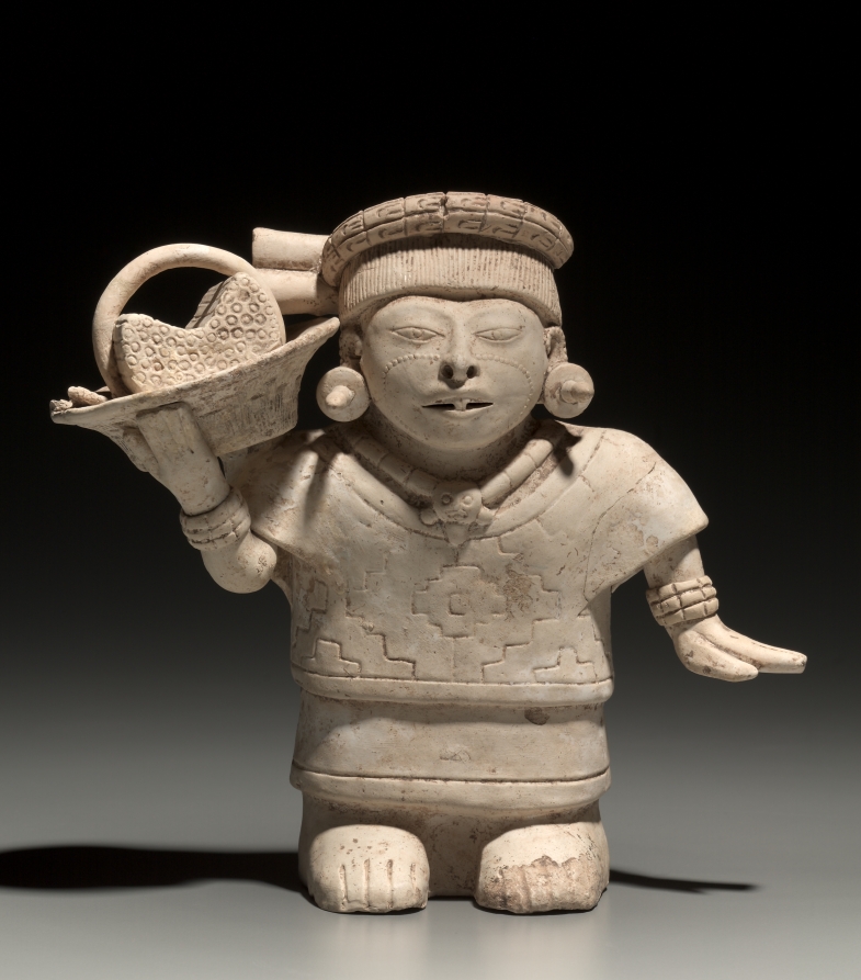 This figure's delicate face features rows of raised dots on the cheeks and the edges of the ears, perhaps representing ornamental scarification; the teeth are decoratively filed into a T or tau shape that may have had symbolic import. On her shoulder she carries a basket or bowl filled with a yet-to-be-identified bundle, perhaps marshy bulrushes. The headdress ties have been lost from one side of the head.