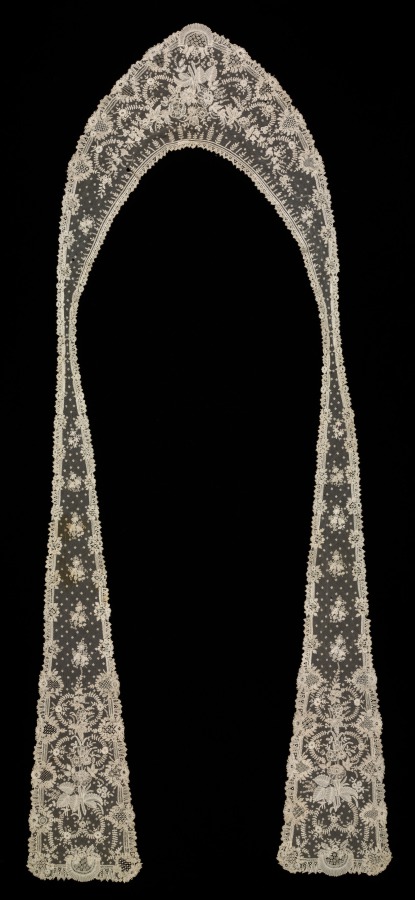 Composite lace. Machine-made netting (reseau), Brussels bobbin lace and French needle point lace; linen