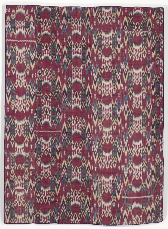 warp ikat, warp-faced plain weave; silk warp, cotton weft; 5-1/2 panels/ original lining: block printed cotton, plain weave; 3 panels