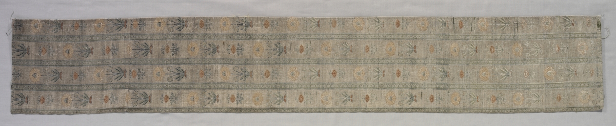 Silk, silver-metal thread: plain weave with inner warps and with continuous and discontinuous supplementary wefts bound in plain and 1/3 Z twill order