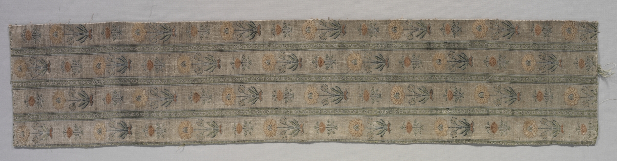 Silk, silver-metal thread: plain weave with inner warps and with continuous and discontinuous supplementary wefts bound in plain and 1/3 Z twill order