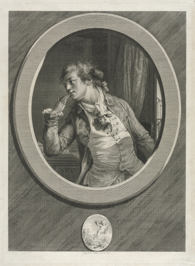 This print is a companion to another depicting a woman telling her lover to "At Least be Discreet," as he slips out of her boudoir. Together the two prints depict a couple saying farewell after a romantic rendezvous. Here, both the man and the cherub beneath him proudly display a plucked rose as a symbol of sexual triumph. Amusingly, the prints actually depict the artist and his wife, whimsically portraying the mores and fashion of French aristocratic society during the 18th century.