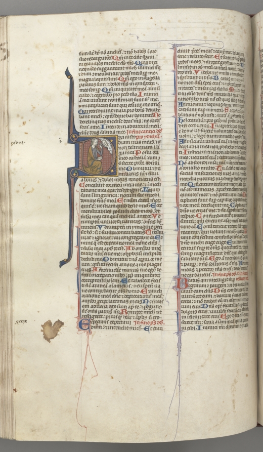 Fol. 220v, Psalm 38, historiated initial D, David kneeling, gesturing to the bust of God above by — VisualArtsDB