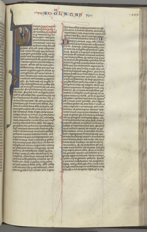 Fol. 449r, Galatians, historiated initial P, Paul seated with a sword, talking to the bust of God above by — VisualArtsDB