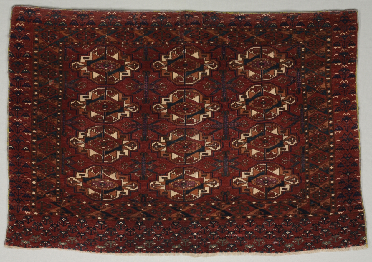 The front of this bag, called a bag face, displays the distinctive hallmarks of the Saryk tribe. The main guls, or lobed motifs, are subdivided in quadrants and alternate with angular minor guls in staggered rows. It is the oldest known weaving of the Saryk tribe, with a soft red ground color and white cotton and magenta silk pile highlights. Essential storage containers, bags were suspended from wall trellises inside tents and transported by pack animals during seasonal migrations. Bags were woven in one piece with pile on the upper part for the front face and plain weave on the lower part for the back face, and then folded and sewn along both sides.